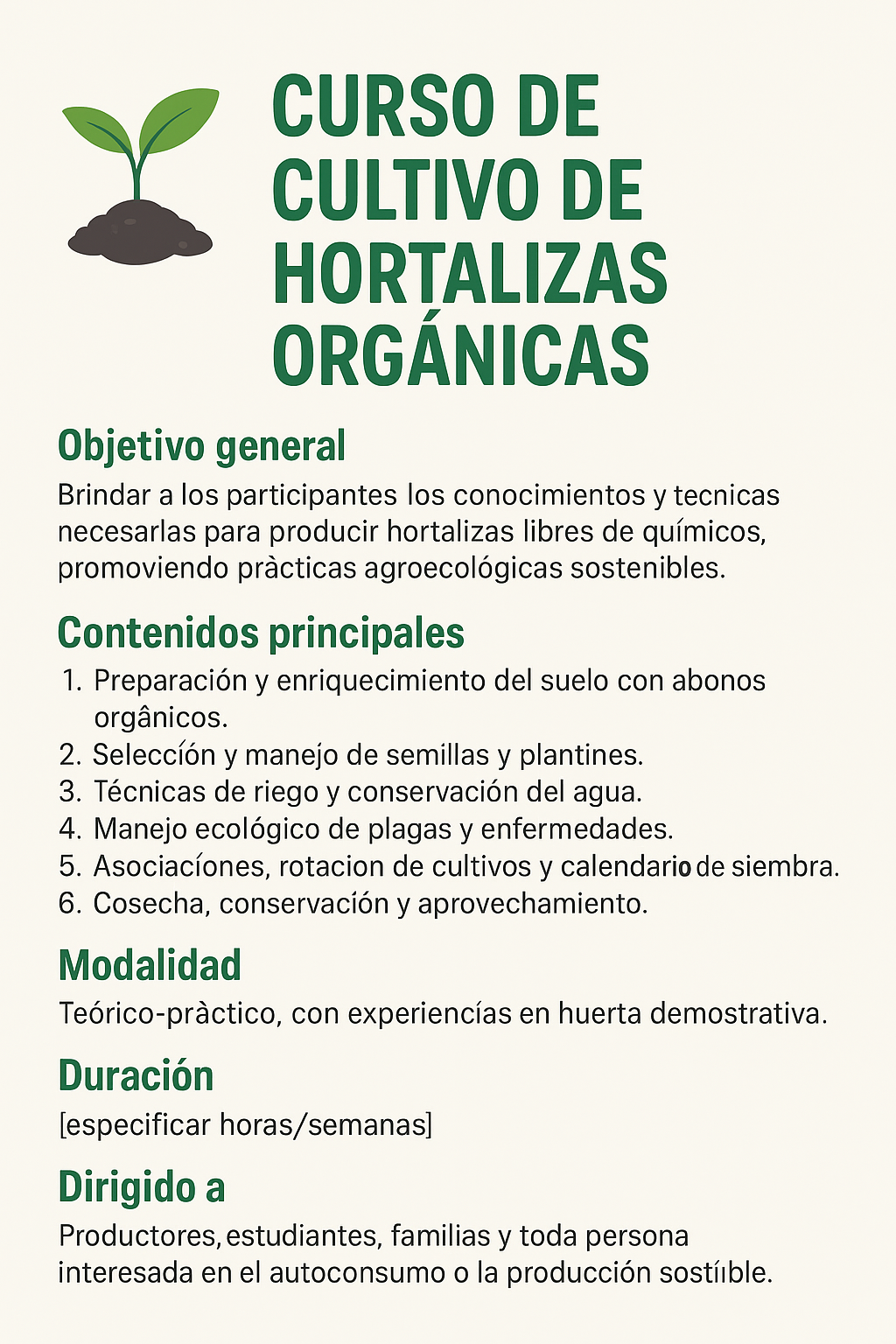 Este curso está diseñado para que los participantes adquieran conocimientos y habilidades prácticas en la producción de hortalizas libres de químicos, aplicando técnicas agroecológicas que cuidan la salud y el medioambiente.